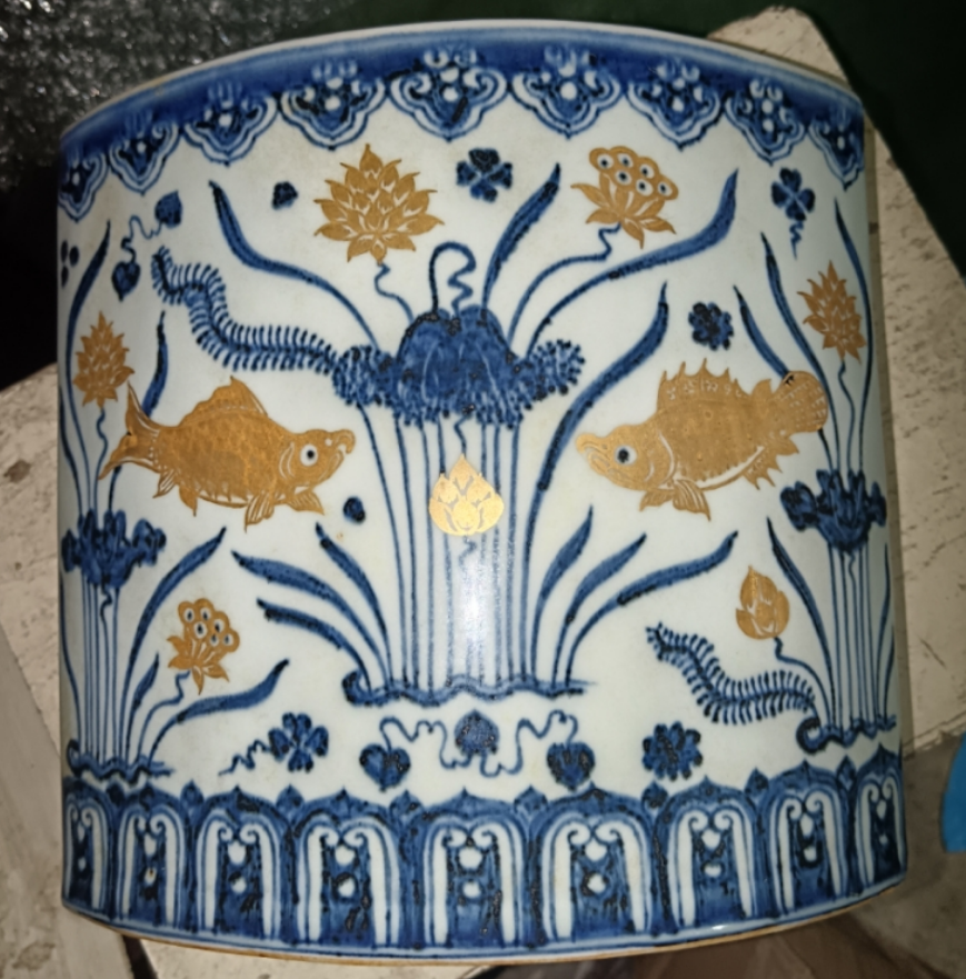 明宣德青花矾红鱼藻纹扇形笔筒
